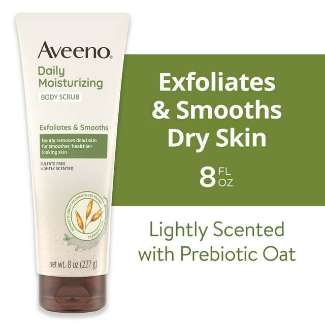Gently exfoliate and remove dead skin with Aveeno Daily Moisturizing Body Scrub. This exfoliating body scrub from a dermatologist-recommended skin care brand for over 70 years works to exfoliate dead surface layers for smoother, healthier looking skin in just one week. Formulated with prebiotic oat to leave skin feeling nourished, the lightly scented, body scrub with moisturizing ingredients is soap-, sulfate-, paraben-, and dye-free. To use, squeeze the body scrub onto a wet washcloth or hands, work into a rich, creamy lather, and rinse. For results, use 3-4 times per week.
