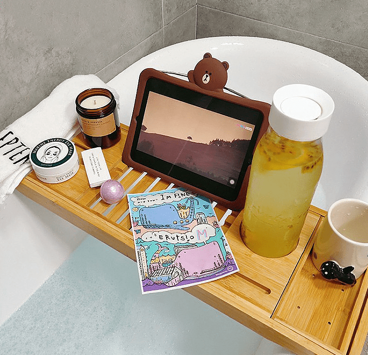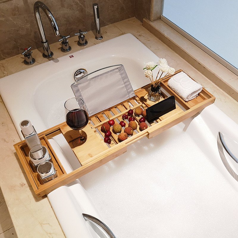 2.ADJUSTABLE TO FIT YOUR BATHTUB: Our bathtub tray table expands from 70cm to 105.5cm. Easy to use, simply pull from each end to your desired width. Slip resistant silicone grips help keep the bathtub organizer securely in place so you won’t have to worry about having any of your personal items fall into the water.