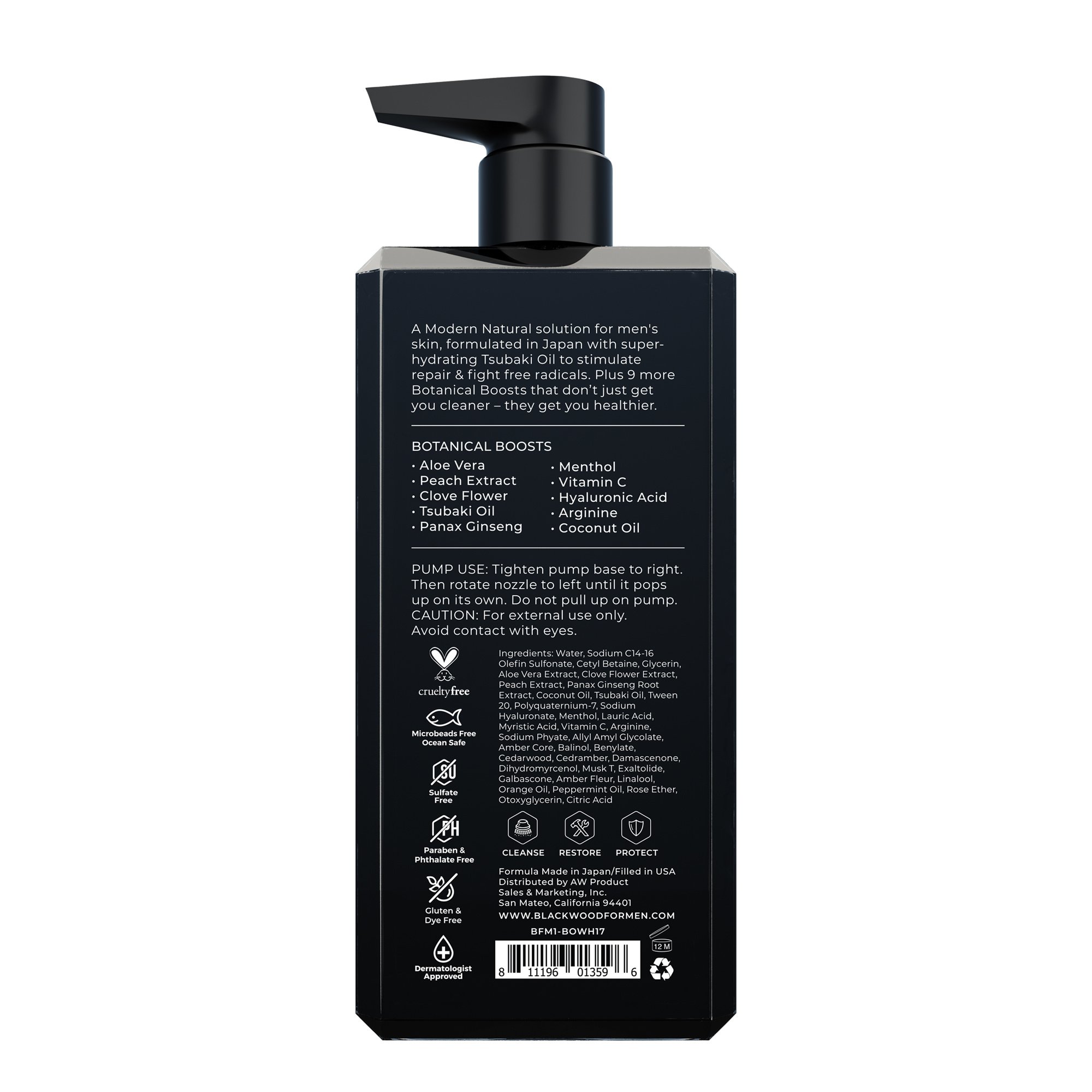 The perfect update to a potent classic. Our new Pure Moisture Body Wash features an even cleaner formula with more powerful Botanical Boosts, including Panax Ginseng & Tsubaki Oil -- two powerful antioxidants that you won't find in other men's products. Ginseng helps stimulate circulation while fighting inflammation, acne & aging signs. Tsubaki Oil penetrates skin to hydrate deep & heal complete. Working in concert with a dozen other Boosts, they create a natural symphony for skin, with Menthol to cool, Arginine to repair & Peach Leaf to protect. It's the ideal cooldown after a tough workout, or wakeup call after a long night out. Plus it lathers up quick and rinses off even quicker, with none of the filmy residue or greasiness of other body washes. Step up your shower with this unique Modern Natural solution for men's skin!