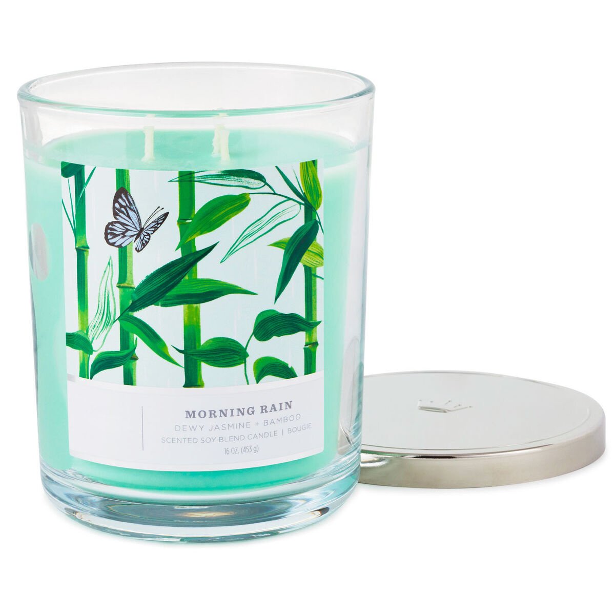 Soothe your soul when you cozy up with a good book and light this three-wick candle with the scent of morning rain. Notes of dewy jasmine; bamboo and cedar will have you feeling relaxed while taking in the aroma of a good; old-fashioned spring storm.