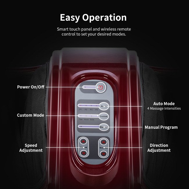 3.3 Custom Modes: 3 custom modes to target your tiptoe, arch of the foot. Kneading, rolling and massaging combine to give reflexology therapies to different organs of the body. Controlled by the touch panel on the unit or the remote control. It's very easy to use.