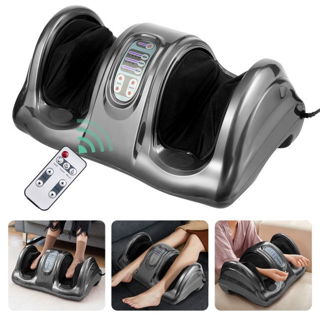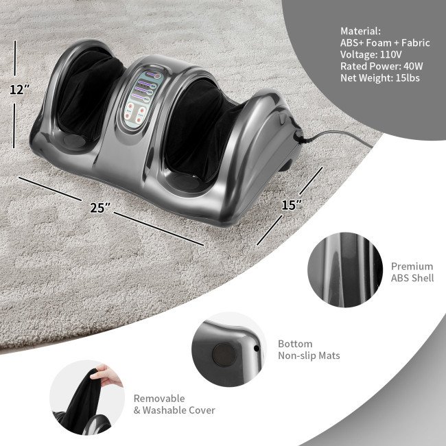 2 sets to fit your needs: automatic setting and personalized settingFeatures 4 modes in an automatic setting to fit your needs and likesDesigned with a manual setting to adjust speed and directionRemote controller for convenient control of the massagerMade of ABS material, foam and fabric for durability and comfortCompact size and lightweight for effortless storage and portabilityIdeal indoor stress reliever in work and leisure timeEasy to cleanFits up to US Men's Size 10, US Women's Size 12; Fits up to calf circumference: 15 inches