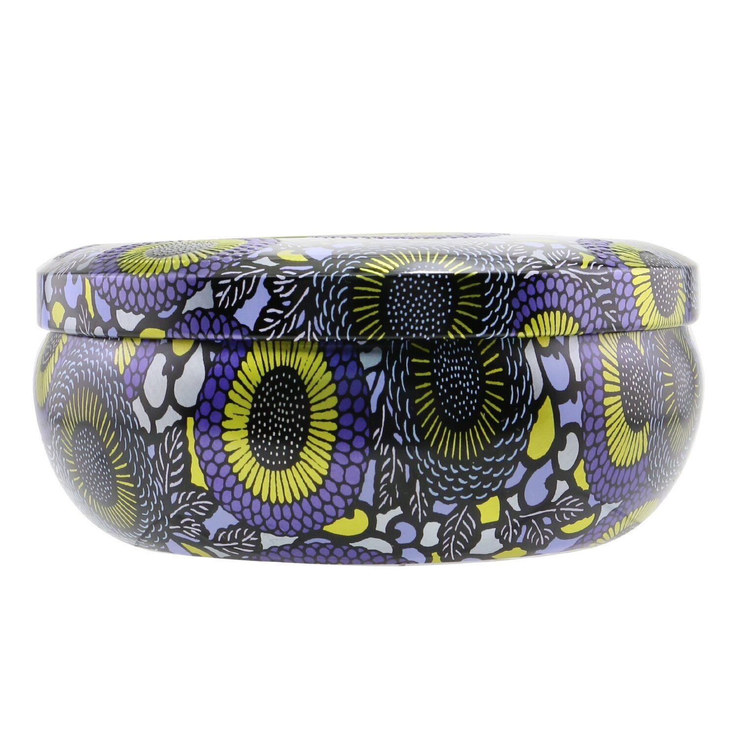 A highly decorative, heavenly-scented tin candleMade with proprietary coconut wax blend with three cotton wicksWarms your space with a soft, inviting fragranceDimensions: 5.31" D x 2.36" HBurn time is approximately 40 hoursHoused in a beautifully patterned metallic tin adorned with rich jewel tonesHand-poured in the U.S.A.Free of phthalates, parabens, sulfates & animal testingCaution: Burn on a heat resistant surface. Do not drop foreign matter or wick-trimmings into candle. Burn in an open area away from drafts. Keep candle burning within sight. Keep out of reach of children & pets